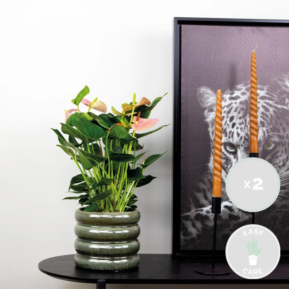 De Anthurium andreanum ‘Aristo’ heeft haar roots liggen in het verre Zuid-Amerika. Deze flamingoplant is zo’n succes door haar sterke karakter en bloei. Niet alleen is zij onderhoudsvriendelijk, ook laat zij haar altijd van haar beste kant zien. De anthurium is namelijk een van de langste non-stop bloeiende potplanten ter wereld. Het hele jaar door kan je genieten van haar felroze hartvormige bloemen. Kortom, de flamingoplant heeft onze harten wel veroverd! Is roze niet jouw kleur? Geen probleem, de anthurium is ook gewoon verkrijgbaar in het rood, wit of zelfs oranje.