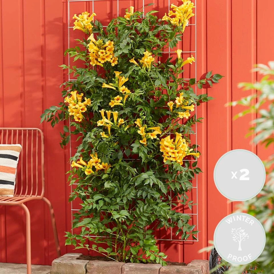 De Campsis Summer Jazz Gold Trumpet is een winterharde klimplant met gele trompetbloemen. Met deze trompetklimmer haal je zo het vakantiegevoel naar eigen tuin. Deze trompetklimmer houdt van de zon en groeit hierdoor langer en uitbundiger. Wanneer je de Campsis wil laten klimmen, kan je gebruik maken van een klimrek. Door de grote, gele en mediterrane bloemen is de Campsis Summer Jazz Gold een echte winnaar voor in jouw tuin, wie wilt dat nou niet?