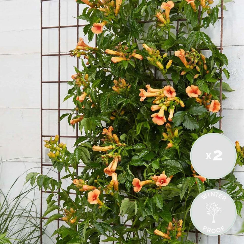 Een echte ‘Indian Summer’ haal je in jouw tuin met de Campsis x tagliabuana ‘Indian Summer’, een winterharde vrolijke trompetklimmer. Deze vrolijke klimplant met oranje trompetbloemen, weten jouw tuin om te toveren in een vrolijke en oranje oase. De bloemen zijn niet alleen mooi voor het oog, maar trekken ook bijen en vlinders aan. De Campsis ‘Indian Summer’ bloeit volop in de zomer en hoeft niet gesnoeid te worden, mocht de plant te groot worden dan kan dit alsnog.