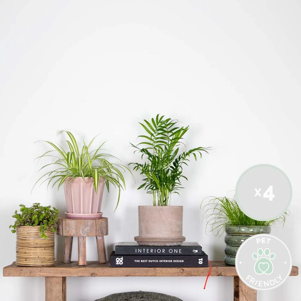 – Geleverd als set van 4 huisdiervriendelijke kamerplanten (1x Cyperus ‘Zumula’, 1x Chlorophytum ‘Variegatum’, 1x Chamaedorea Elegans, 1x Callisia ‘Repens’).