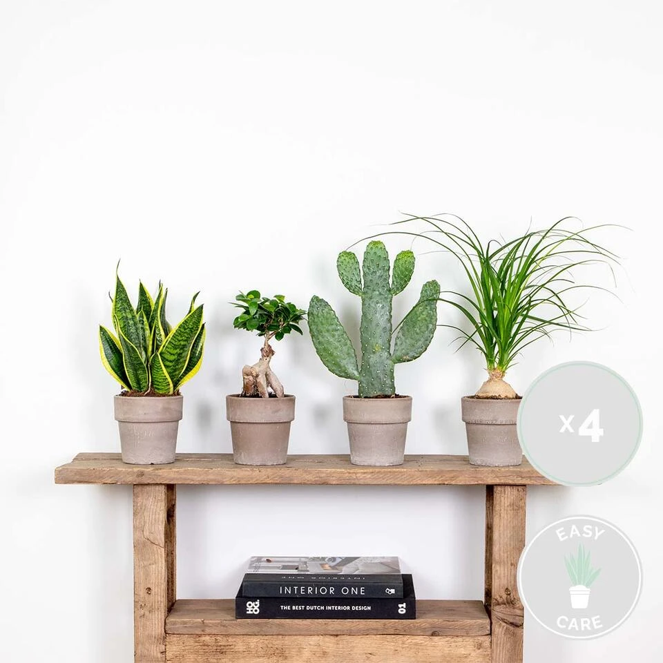 Waan je in de tropen met deze tropische kamerplanten mix! Deze mix bestaat uit vier tropische hunks: Opuntia-Ficus-Sansevieria-Beaucarnea én zijn ook nog eens gemakkelijk in de omgang. Deze vier kamerplanten zijn stuk voor stuk uniek gevormd en zorgen in een mum van tijd dat jouw huis omgetoverd wordt tot een waar tropisch oord. Door hun onderhoudsvriendelijke karakter zijn zij ideaal voor diegene met lichtgroene vingers.