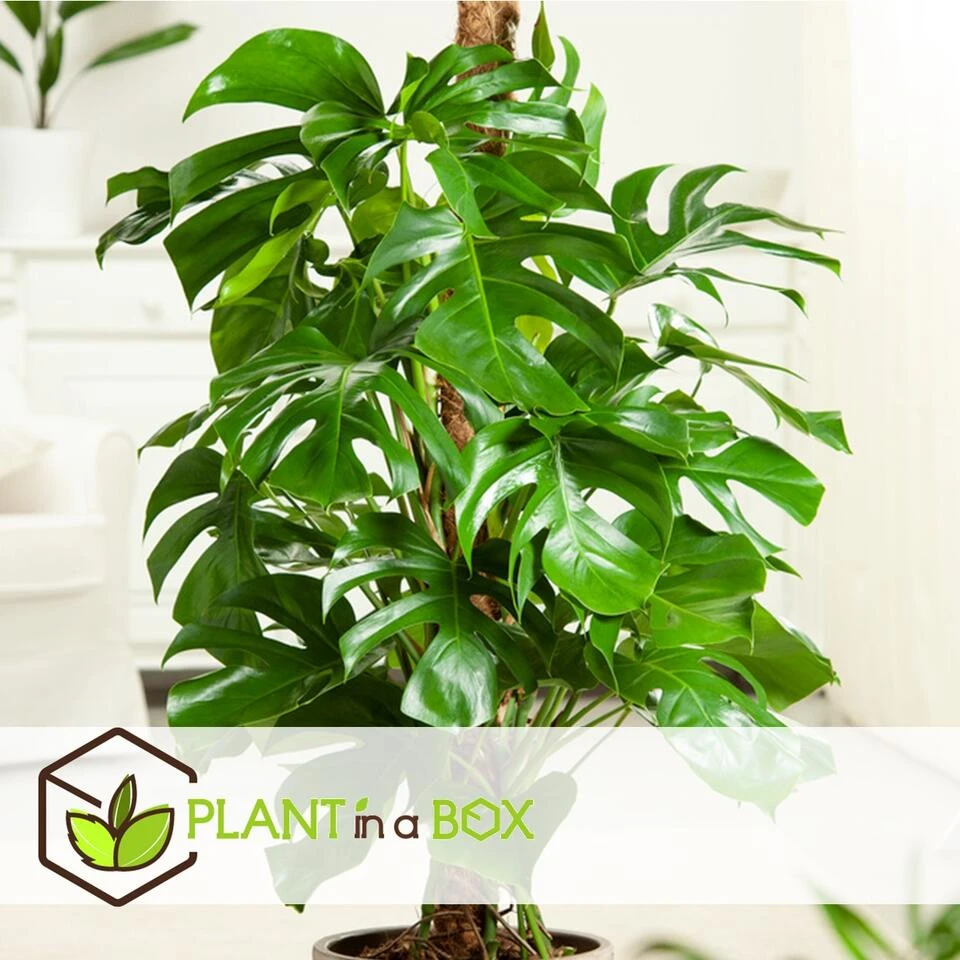 Deze gigantische Monstera is een tropische plant met bladeren waar gaten in zitten. Omdat dit zo ongewoon is, is de plant ‘Monstera’ genoemd, wat ‘vreemd’ betekent in het Latijn. Verder wordt de plant ook wel ‘Gatenplant’ genoemd. Deze gaten zien er niet alleen leuk uit, maar in de natuur zijn deze ook heel nuttig. Ze voorkomen namelijk dat de plant omver wordt geblazen in een storm, doordat de wind en regen grotendeels door de gaten heen gaan. Oorspronkelijk komt de Monstera uit Zuid- en Midden-Amerika waar hij vaak tegen boomstammen omhoog groeit, of over de grond kronkelt. Bij deze plant wordt daarom een mosstok geleverd waar hij aan omhoog kan groeien.
