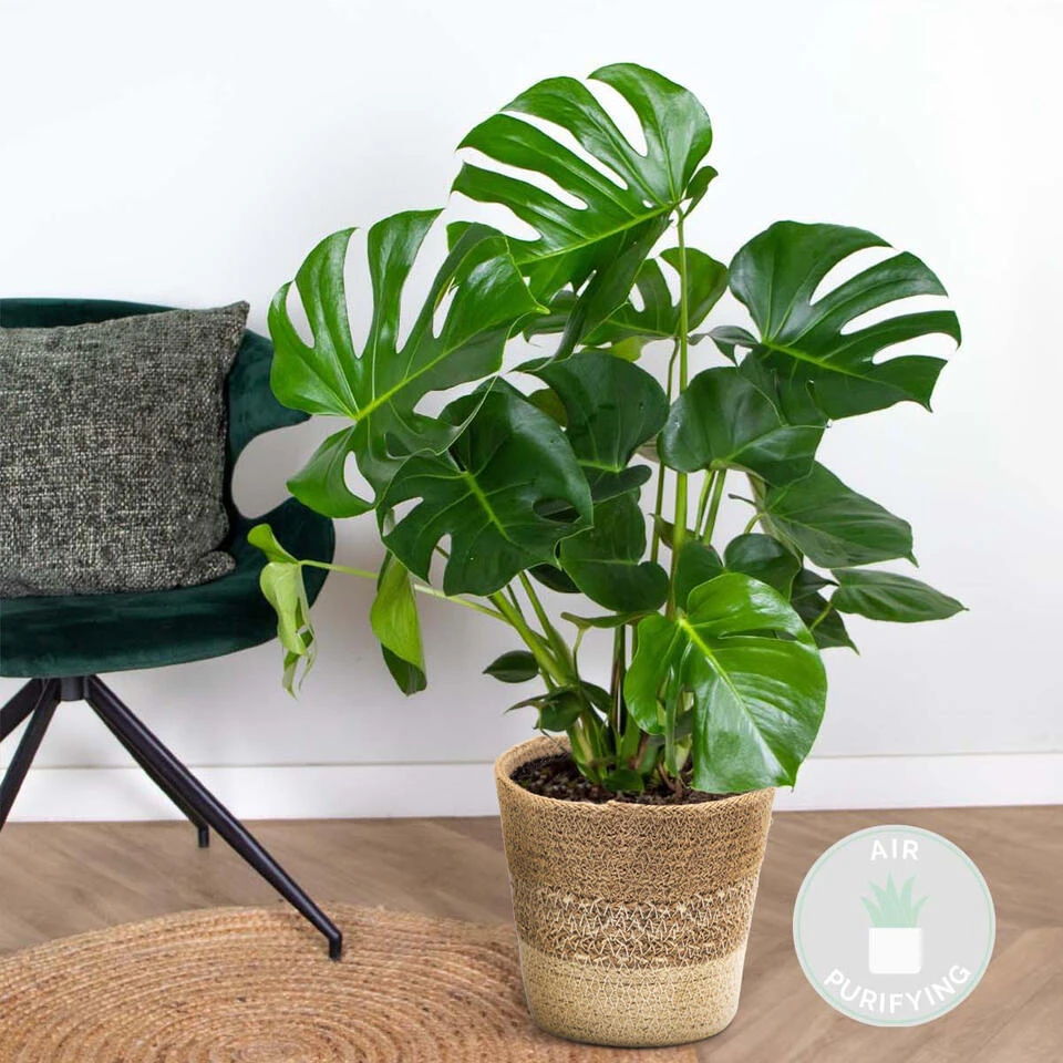 Een regelrechte tropische topper: de Monstera Deliciosa Incl. Jute Mand Nea. Met zijn grote, groene bladeren heeft deze gatenplant ook nog eens luchtzuiverende eigenschappen. Op deze manier produceert hij extra zuurstof en filtert hij schadelijke stoffen uit de lucht. Zijn grote bladeren bevatten gaten en worden met de jaren alsmaar groter wat hem erg bijzonder maakt. Een kamerplant die niet alleen zorgt voor een beter binnenklimaat, maar die ook nog eens de show steelt!